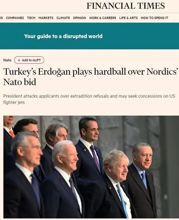 Londonda çıxan "Financial Times" qəzeti yazıb ki, prezident Ərdoğanın NATO-ya yeni üzvlüyü əngəlləməklə bağlı açıqlamaları ciddi qəbul edilməlidir. "Ərdoğan Skandinaviya ölkələrinin NATO üzvlüyü ilə zarafat etmir" başlıqlı xəbərdə Türkiyənin İsveç hakimiyyətinin terror təşkilatının yüksək səviyyəli adları ilə görüşməsinə qəzəbləndiyi bildirilib.