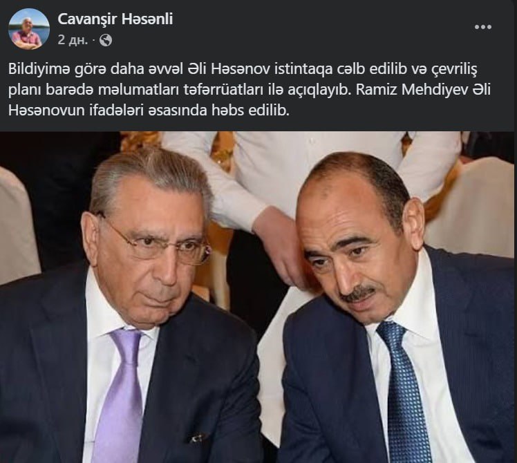 "Bildiyimə görə daha əvvəl Əli Həsənov istintaqa cəlb edilib və çevriliş planı barədə məlumatları təfərrüatları ilə açıqlayıb. Ramiz Mehdiyev Əli Həsənovun ifadələri əsasında həbs edilib", - deyə Cavanşir Həsənli qeyd edib.
