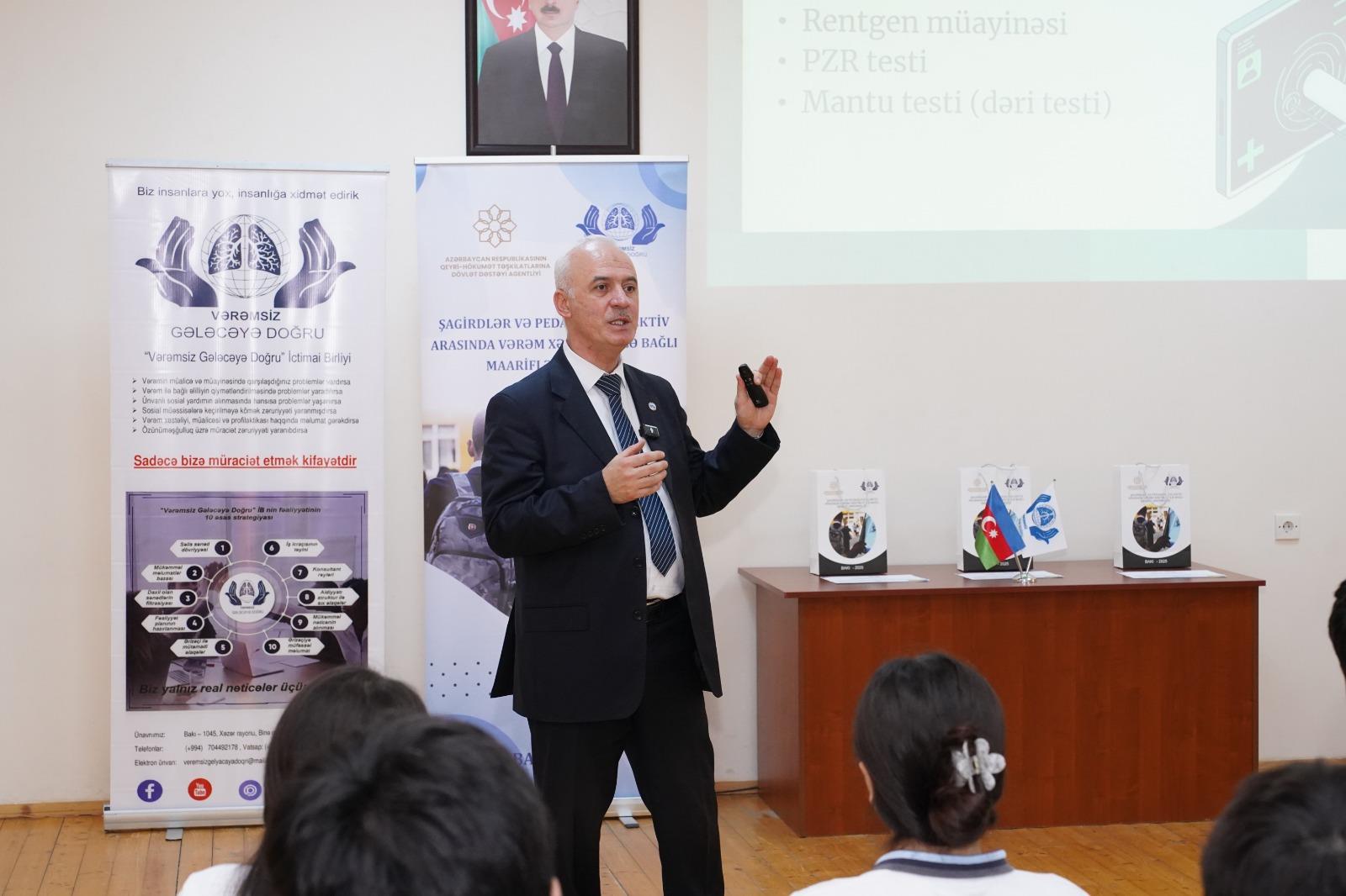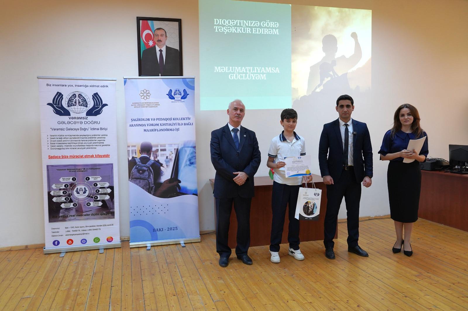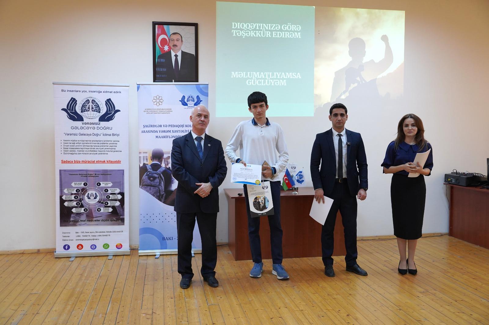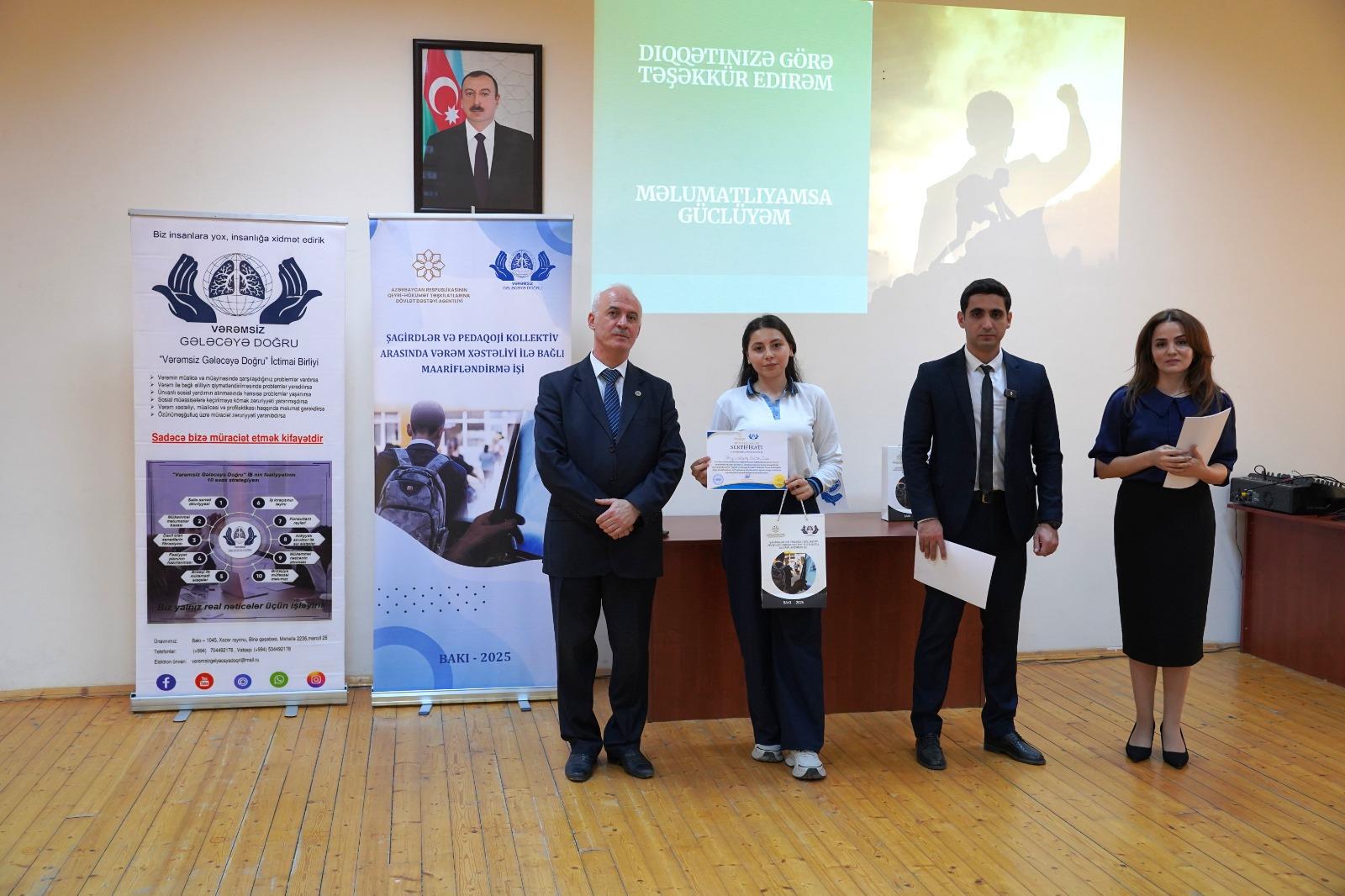 QHT.az xəbər verir ki, tədbir Azərbaycan Respublikasının Qeyri-Hökumət Təşkilatlarına Dövlət Dəstəyi Agentliyinin maliyyə dəstəyi ilə həyata keçirilən “Vərəmin profilaktikası üzrə maarifləndirmə tədbirlərinin təşkili” layihəsi çərçivəsində baş tutub.