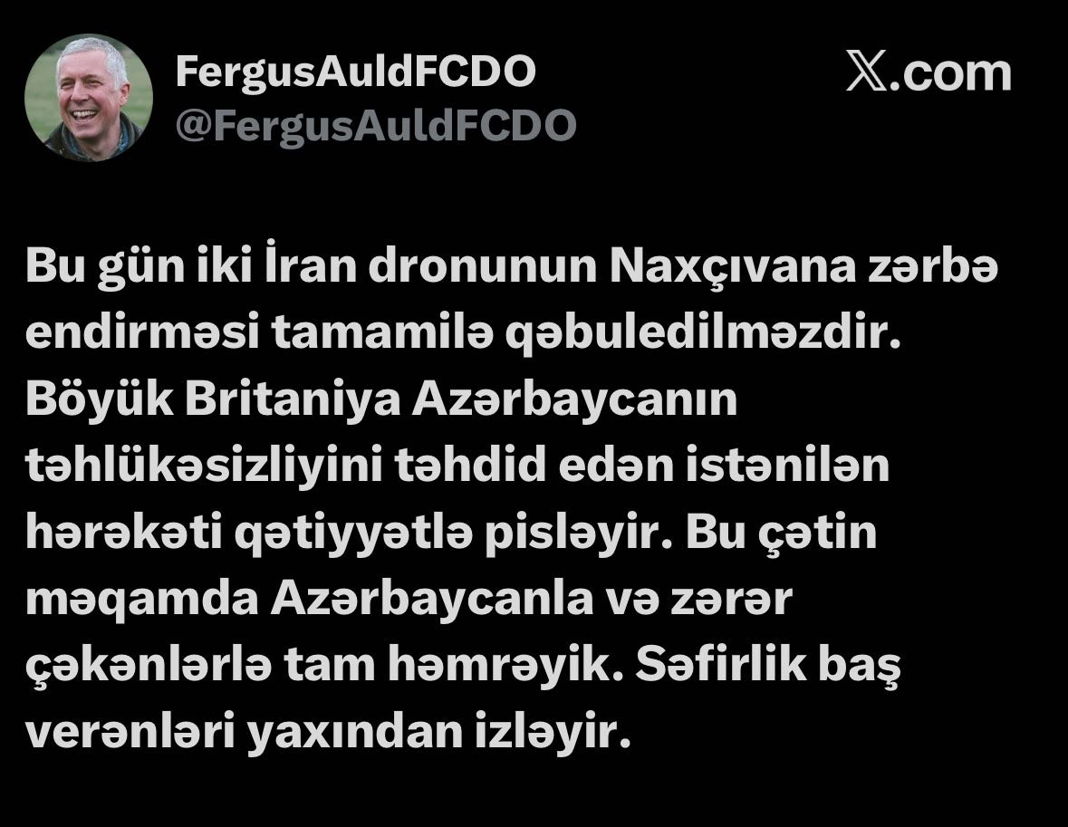 Turkustan.az xəbər verir ki, bu fikirləri Böyük Britaniyanın Azərbaycandakı səfiri Ferqus Auld “X” hesabında bildirib.