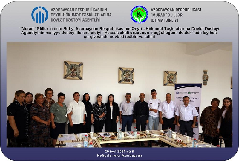 "Murad" Əlillər İctimai Birliyi Azərbaycan Respublikasının Qeyri - Hökumət Təşkilatlarına Dövlət Dəstəyi Agentliyinin maliyyə dəstəyi ilə icra etdiyi "Həssas əhali qrupunun məşğulluğuna dəstək" adlı layihəsi çərçivəsində növbəti tədbiri və təlimi 29 iyul 2024-cü il tarixində Neftçala rayonunda təşkil edib.