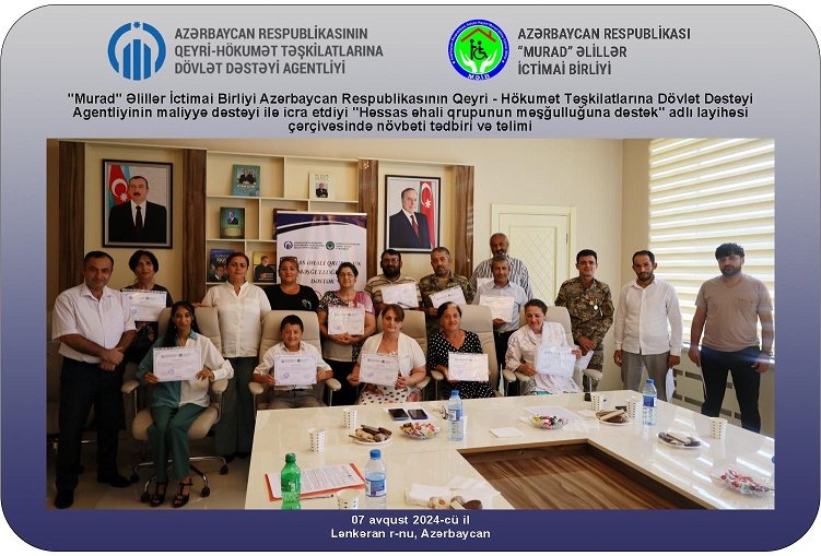 "Murad" Əlillər İctimai Birliyi Azərbaycan Respublikasının Qeyri - Hökumət Təşkilatlarına Dövlət Dəstəyi Agentliyinin maliyyə dəstəyi ilə icra etdiyi "Həssas əhali qrupunun məşğulluğuna dəstək" adlı layihəsi çərçivəsində növbəti tədbiri və təlimi 07 avqust 2024-cü il tarixində Lənkəran rayonunda təşkil edib.