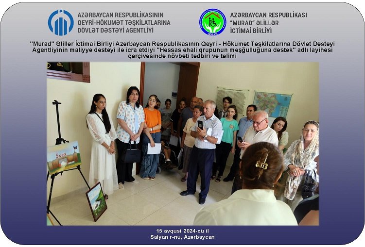 "Murad" Əlillər İctimai Birliyi Azərbaycan Respublikasının Qeyri - Hökumət Təşkilatlarına Dövlət Dəstəyi Agentliyinin maliyyə dəstəyi ilə icra etdiyi "Həssas əhali qrupunun məşğulluğuna dəstək" adlı layihəsi çərçivəsində yekun təlimini və sərgisini 15 avqust 2024-cü il tarixində Salyan rayonunda təşkil edib.