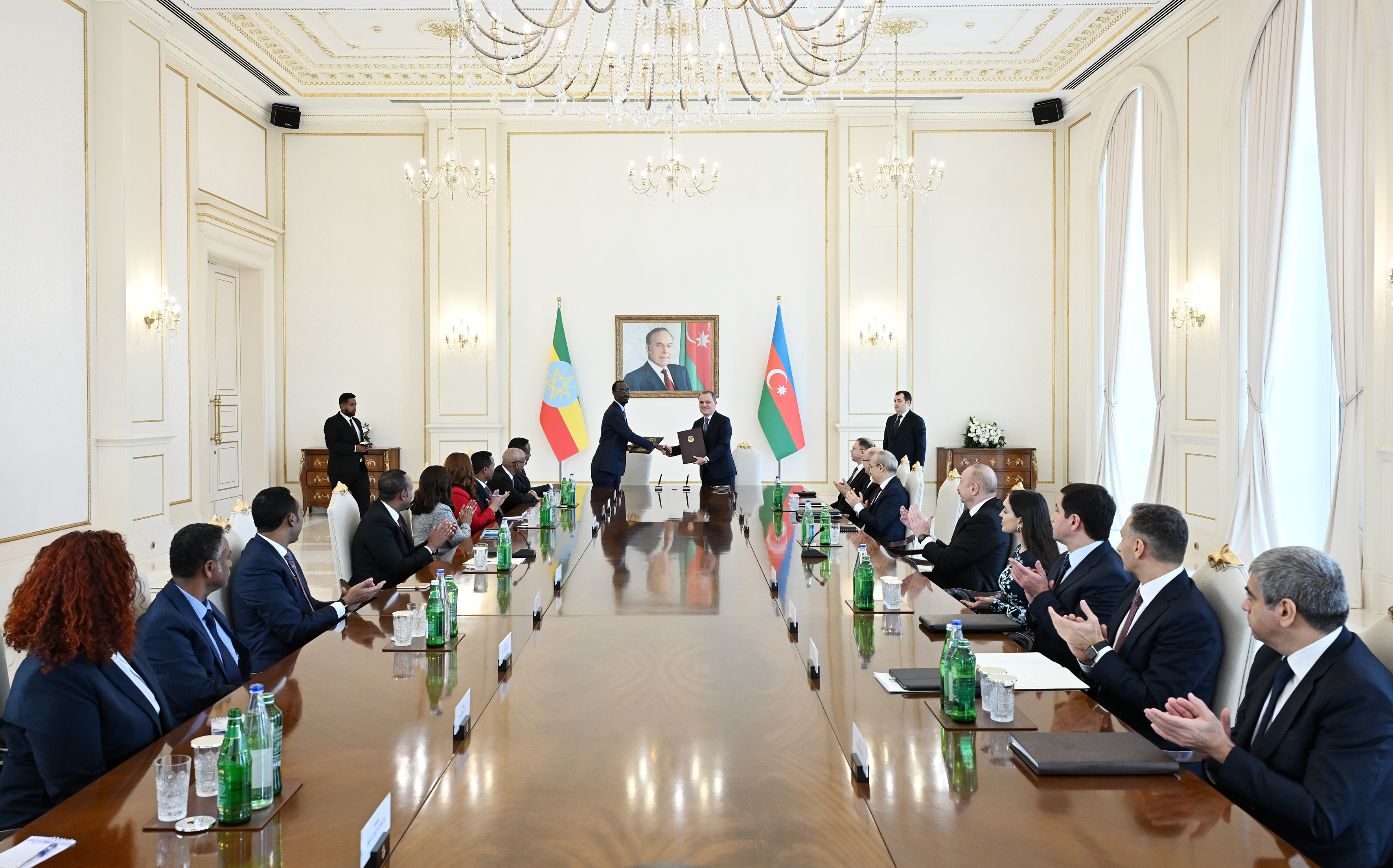 Daha sonra Azərbaycan Prezidenti İlham Əliyevin və Efiopiyanın Baş naziri Abiy Əhməd Əlinin iştirakı ilə Azərbaycanın xarici işlər naziri Ceyhun Bayramov və Efiopiyanın xarici işlər naziri Qedion Timoteos "Azərbaycan Respublikası ilə Efiopiya Federativ Demokratik Respublikası Hökuməti arasında müdafiə sahəsində əməkdaşlıq haqqında Saziş”i və “Birləşmiş Millətlər Təşkilatının İqlim Konfransının (COP32) otuz ikinci sessiyasının təşkilində əməkdaşlıq haqqında Anlaşma Memorandumu”nu imzaladılar.
