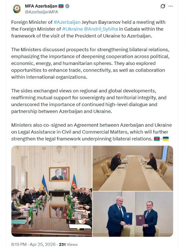 Turkustan.az xəbər verir ki, bu barədə Azərbaycan Xarici İşlər Nazirliyinin (XİN) "X" sosial şəbəkə hesabında məlumat yayılıb.