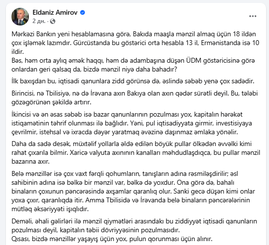 “Mərkəzi Bankın yeni hesablamasına əsasən, Bakıda orta aylıq əmək haqqı ilə mənzil almaq üçün təxminən 18 ildən çox fasiləsiz işləmək lazımdır”.