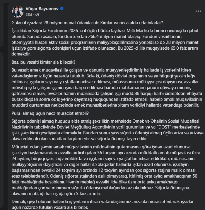 “İşsizlikdən Sığorta Fondunun 2026-cı il üçün büdcə layihəsi Milli Məclisdə birinci oxunuşda qəbul olunub. Sənədə əsasən, fondun xərcləri 266.4 milyon manat olacaq. Fondun vəsaitlərinin əhəmiyyətli hissəsi aktiv sosial proqramların maliyyələşdirilməsinə yönəldilsə də 28 milyon manat işsizliyə görə sığorta ödənişləri üçün istifadə olunacaq. Bu 2025-ci illə müqayisədə 65.0 faiz artım deməkdir”.