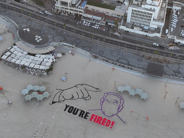 Fəallar Netanyahunun şəklini üzərinə ingilis dilində “You’re fired” (“Sən işdən çıxarıldın”) sözləri yazılmış plakatda əks etdiriblər. Onlar bu yolla baş nazirin ölkəni yanlış istiqamətə apardığını və artıq istefa verməsinin vaxtının çatdığını vurğulayıblar.